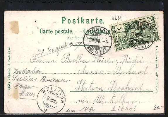 gelaufen 1900, rückseitig Klebe- und Papierreste, Ecken bestoßen, guter Zustand