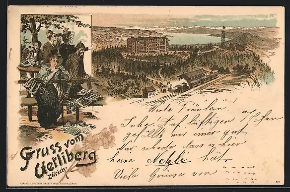 Lithographie Zürich, Gasthof Uetliberg mit Bahnhof und Gästen