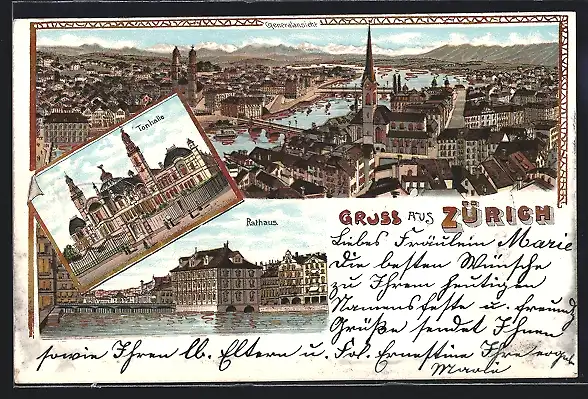 Lithographie Zürich, Generalansicht, Tonhalle, Rathaus
