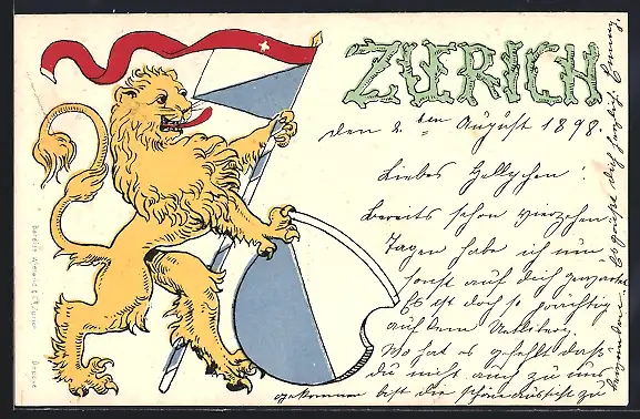 Lithographie Zürich, Löwe mit Flagge und Wappen