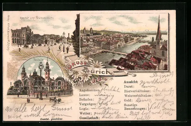 Lithographie Zürich, Ortsansicht, Bahnhof, Tonhalle