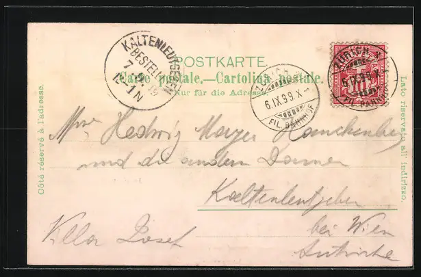 Personenbezogene Daten auf der Rückseite der Karte wurden durch blauen Textmarker unkenntlich gemacht. Die blauen Stellen sind auf die Vorderseite durchgeweicht und wirken sich negativ auf das Postkartenfoto aus