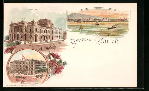 Lithographie Zürich, Ortsansicht. Theater, See mit Booten
