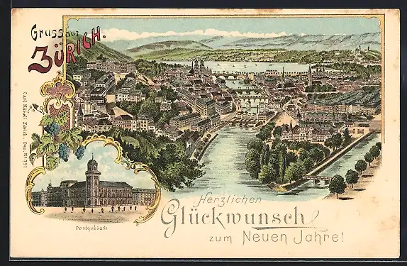 Lithographie Zürich, Panorama mit Brücken, Postgebäude