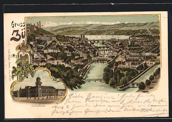 Lithographie Zürich, Teilansicht mit Brücken, Postgebäude