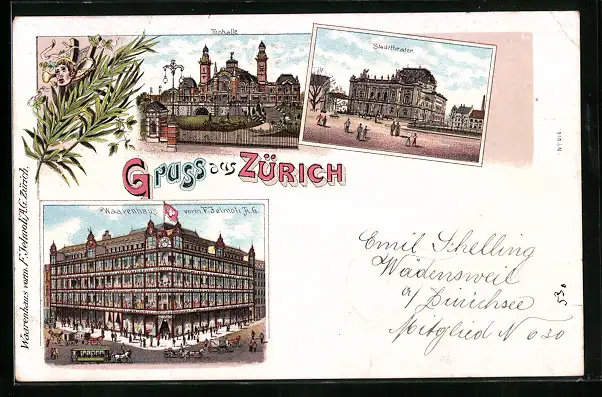 Lithographie Zürich, Tonhalle, Stadttheater, Warenhaus