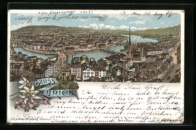 Lithographie Zürich, Totalansicht der Stadt mit Limmat