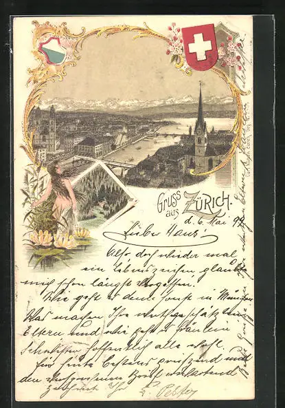 Lithographie Zürich, Totalansicht mit Limmat, Nymphe im Schilf