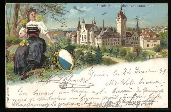 Lithographie Zürich, Zürcherin und das Landesmuseum, Wappen