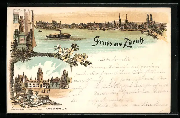 Lithographie Zürich, Zwinglidenkmal, Landesmuseum und Stadtansicht