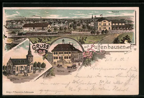 Lithographie Zuffenhausen, Ortsansicht mit Bahnhof, Rathaus, Kirche