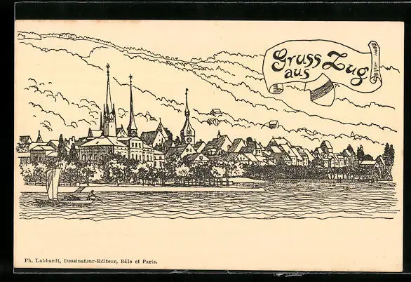Lithographie Zug, Teilansicht mit Segelboot