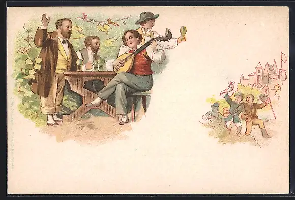 Lithographie Zug fröhlicher Studenten, Garten-Runde beim Wein mit Laute