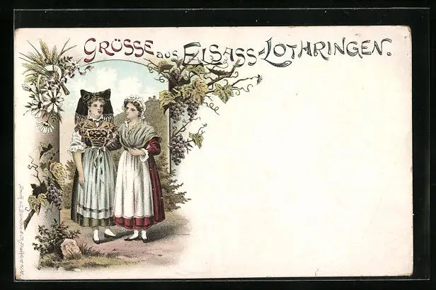Lithographie Zwei Frauen in elsass-lothringischer Tracht