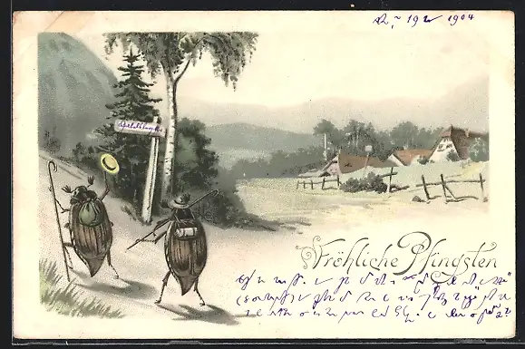 Lithographie Zwei Maikäfer auf Wanderschaft vor einem kleinen Ort in den Bergen