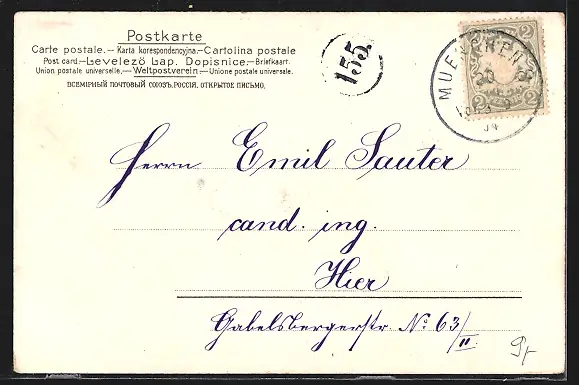 Personenbezogene Daten auf der Rückseite der Karte wurden durch blauen Textmarker unkenntlich gemacht. Die blauen Stellen sind auf die Vorderseite durchgeweicht und wirken sich negativ auf das Postkartenfoto aus