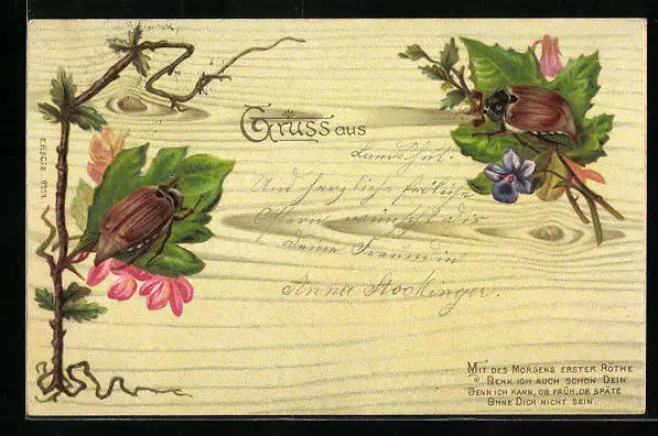 Lithographie Zwei Maikäfer auf den Blättern von Blumen