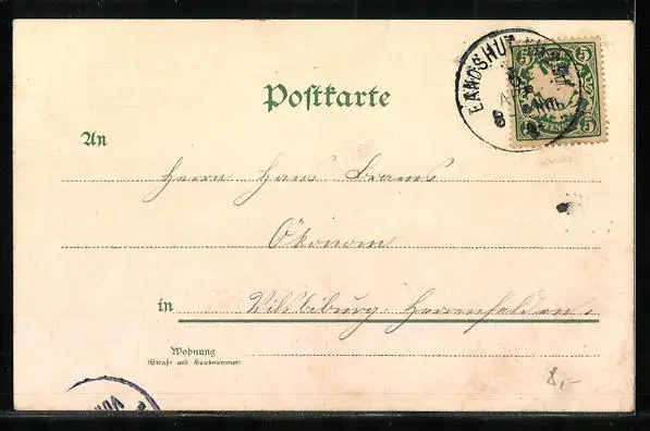 Personenbezogene Daten auf der Rückseite der Karte wurden durch blauen Textmarker unkenntlich gemacht. Die blauen Stellen sind auf die Vorderseite durchgeweicht und wirken sich negativ auf das Postkartenfoto aus
