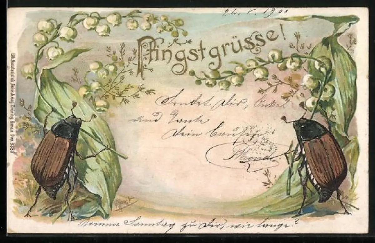 Lithographie Zwei Maikäfer halten Maiglöckchenstengel und bilden ein Portal