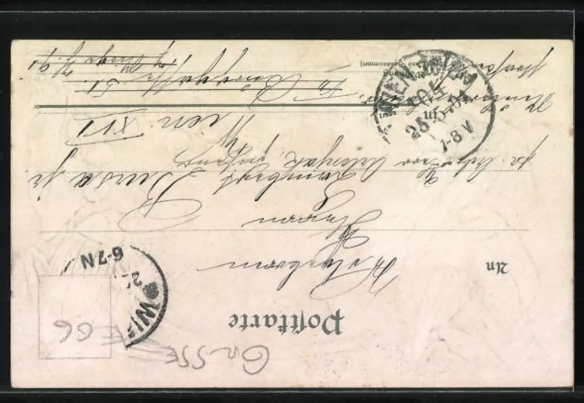 Personenbezogene Daten auf der Rückseite der Karte wurden durch blauen Textmarker unkenntlich gemacht. Die blauen Stellen sind auf die Vorderseite durchgeweicht und wirken sich negativ auf das Postkartenfoto aus