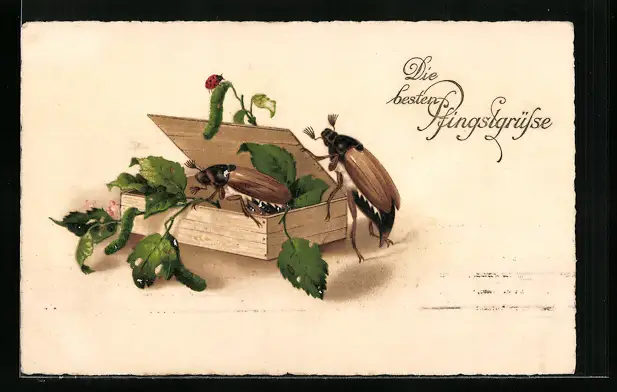 Lithographie Zwei Maikäfer mit Zigarrenkiste, Marienkäfer, Pfingstgruss