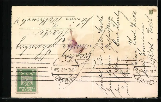 Personenbezogene Daten auf der Rückseite der Karte wurden durch blauen Textmarker unkenntlich gemacht. Die blauen Stellen sind auf die Vorderseite durchgeweicht und wirken sich negativ auf das Postkartenfoto aus