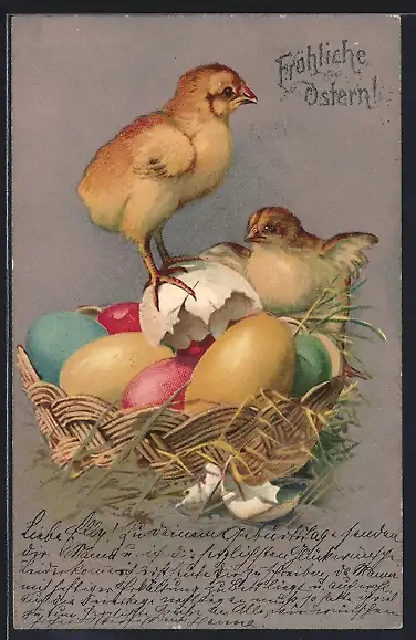 Lithographie Zwei Osterküken in einem Körbchen mit Ostereiern, Ostergruss