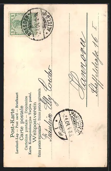 Personenbezogene Daten auf der Rückseite der Karte wurden durch blauen Textmarker unkenntlich gemacht. Die blauen Stellen sind auf die Vorderseite durchgeweicht und wirken sich negativ auf das Postkartenfoto aus
