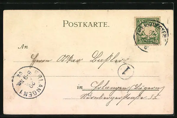 Personenbezogene Daten auf der Rückseite der Karte wurden durch blauen Textmarker unkenntlich gemacht. Die blauen Stellen sind auf die Vorderseite durchgeweicht und wirken sich negativ auf das Postkartenfoto aus