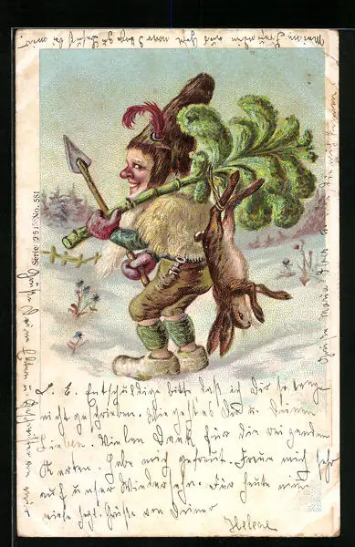 Lithographie Zwerg im Schnee mit gefangenem Hasen