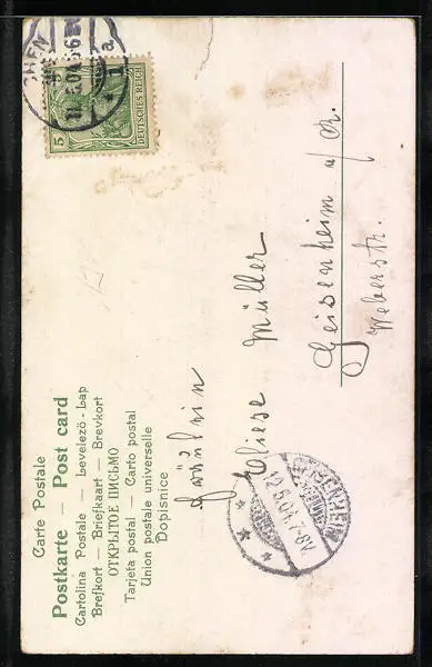 Personenbezogene Daten auf der Rückseite der Karte wurden durch blauen Textmarker unkenntlich gemacht. Die blauen Stellen sind auf die Vorderseite durchgeweicht und wirken sich negativ auf das Postkartenfoto aus