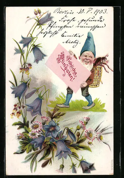 Lithographie Zwerg mit Pfingstgrüssen und Maikäfer
