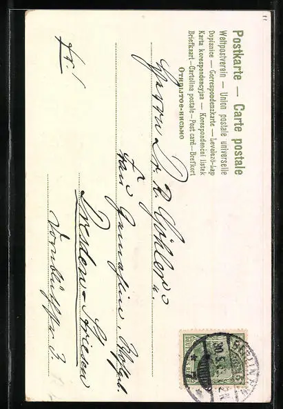 Personenbezogene Daten auf der Rückseite der Karte wurden durch blauen Textmarker unkenntlich gemacht. Die blauen Stellen sind auf die Vorderseite durchgeweicht und wirken sich negativ auf das Postkartenfoto aus