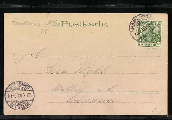 Personenbezogene Daten auf der Rückseite der Karte wurden durch blauen Textmarker unkenntlich gemacht. Die blauen Stellen sind auf die Vorderseite durchgeweicht und wirken sich negativ auf das Postkartenfoto aus