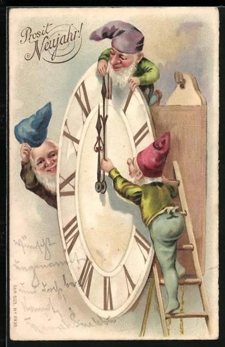 Lithographie Zwerge stellen eine Uhr auf 12, Prosit Neujahr