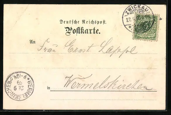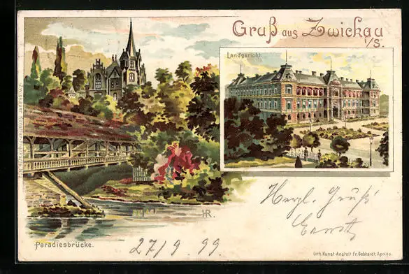 Lithographie Zwickau i. S., Landgericht, Paradiesbrücke