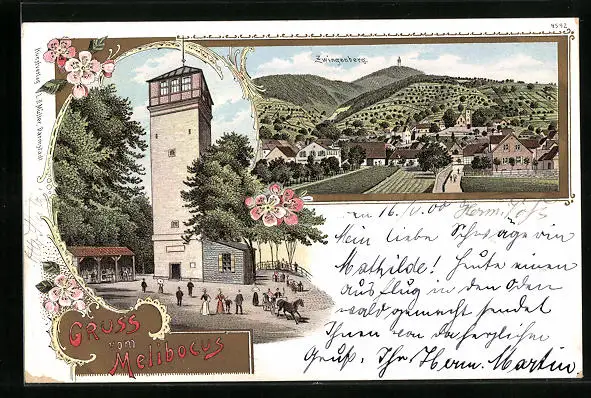 Lithographie Zwingenberg, Melibocus, Ortsansicht, Turm