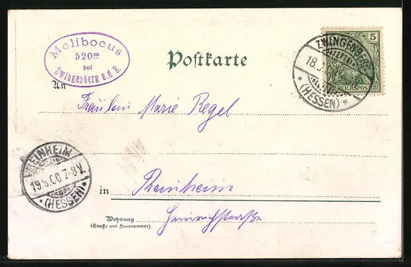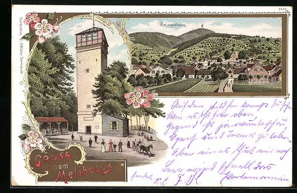 Lithographie Zwingenberg a. d. B., Melibocus, Aussichtsturm, Ortsansicht