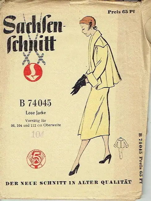 guter Zustand, geringe Gebrauchs- und Alterungsspuren: Umschlag defekt und geöffnet (Kleber der Schließen altersschwach) - Schnittmuster offenbar unbenutzt - Schnittmuster noch original zusammengelegt, das hier ist die Ausgabe für 104 cm Oberweite (gestempelt mit einer 104), bestehend aus 8 Teilen, Papier, ca. 12 x 16