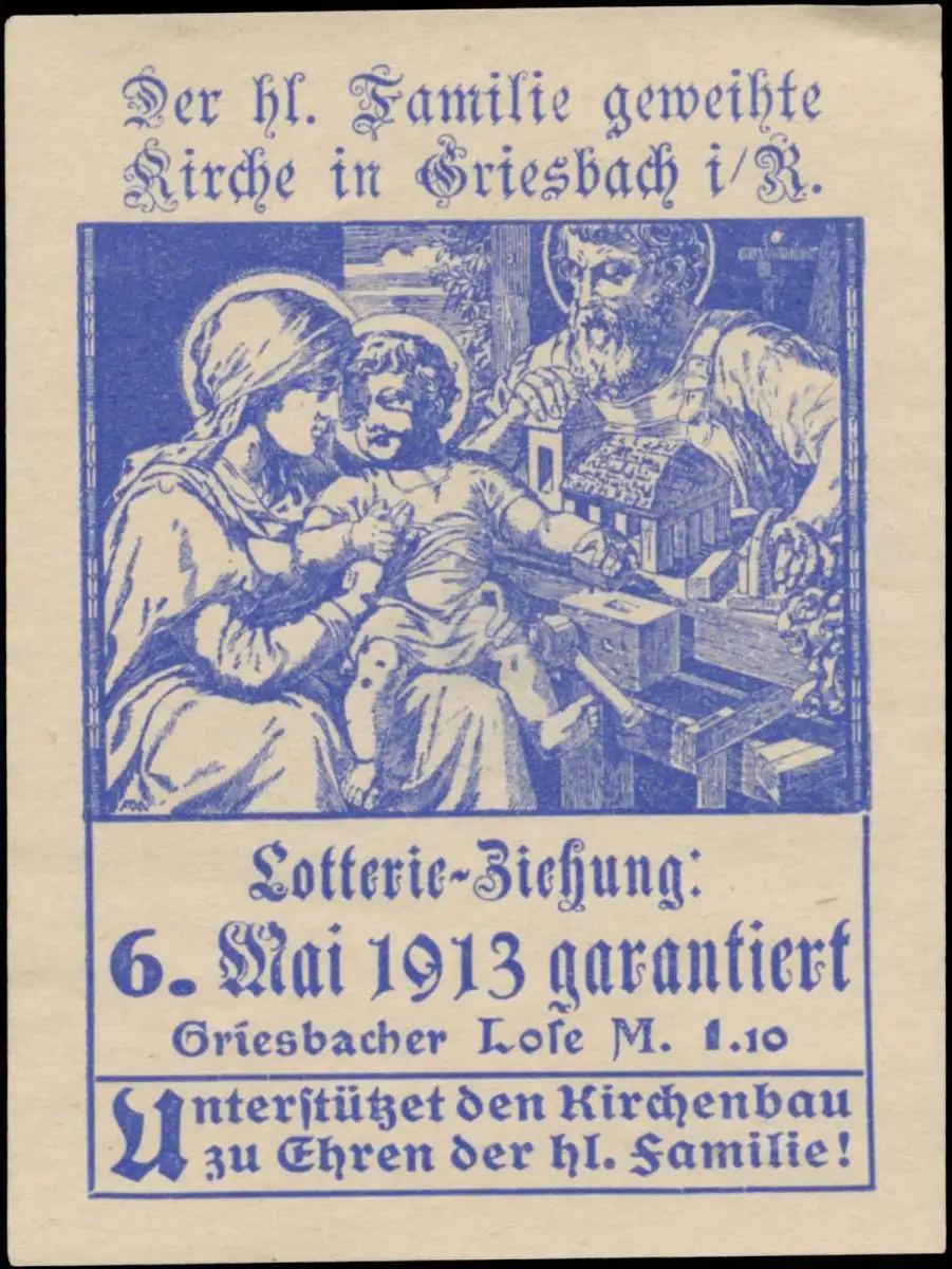 Lotterie-Ziehung 6. Mai 1913 der heiligen Familie geweihte Kirche in Griesbach im Rottal , Größe/Zustand: 8x8 , guter Zustand, Original alte Reklamemarke die seinerzeit für die Werbung benutzt wurde