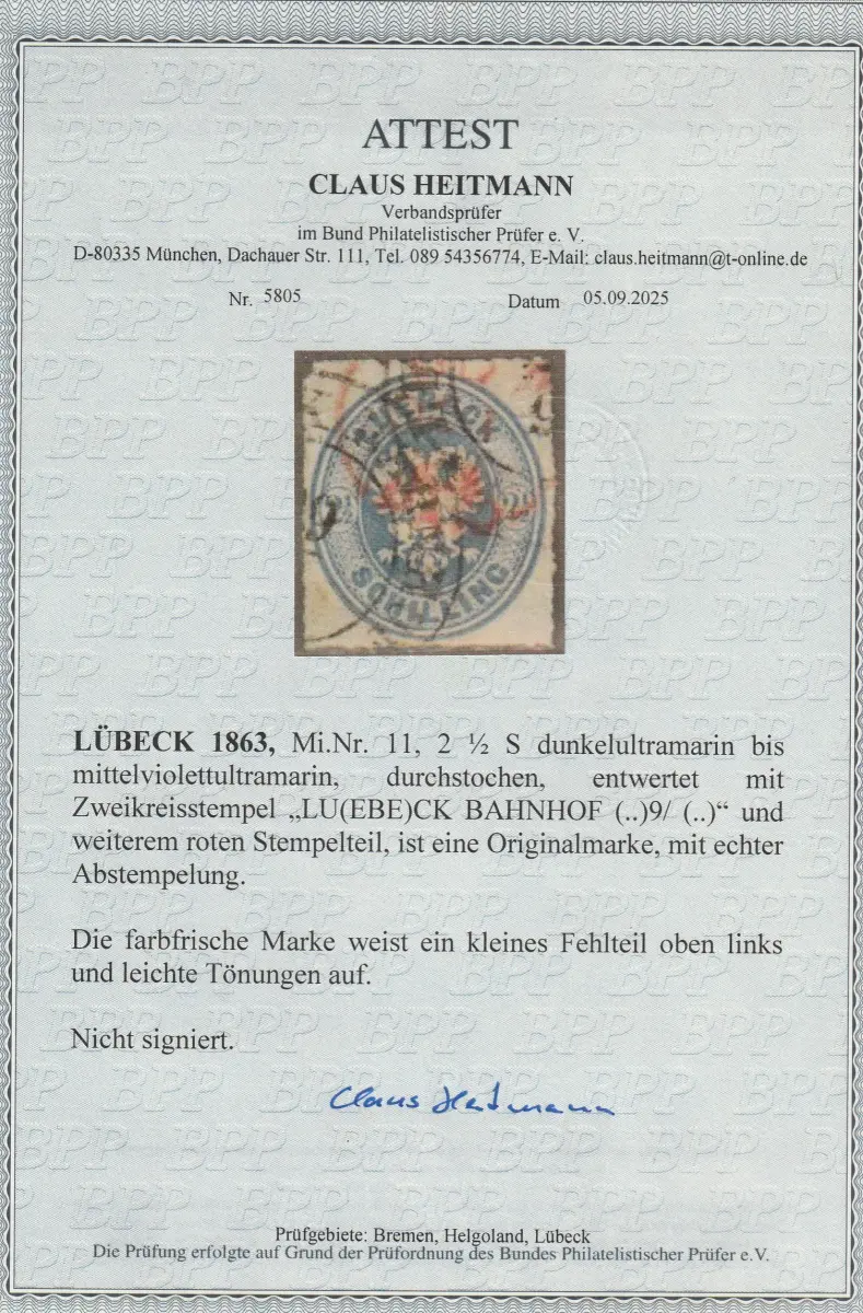 Lübeck Nr. 11, gestempelt, BPP-Attest