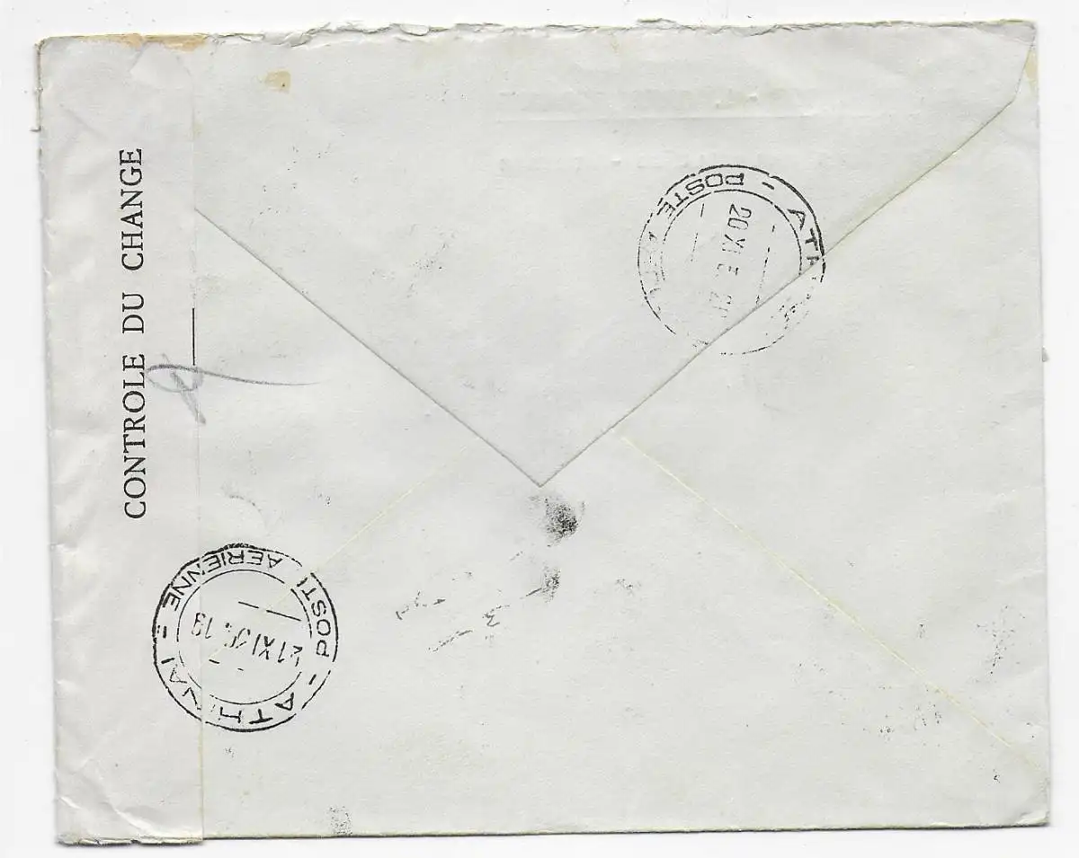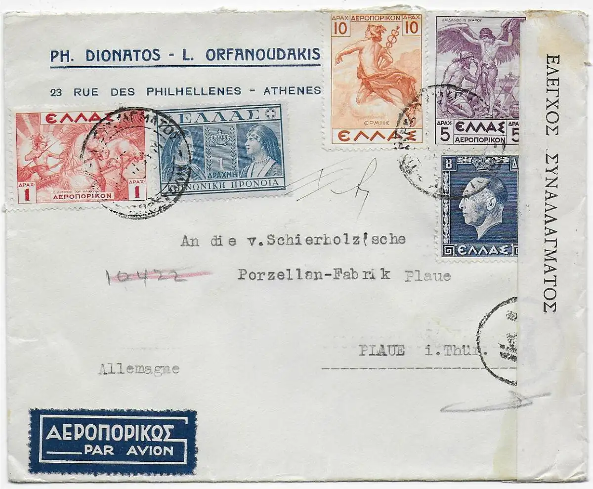 Luftpost Athen nach Plaue/Porzellan Fabrik, Zensur Devisen 1939