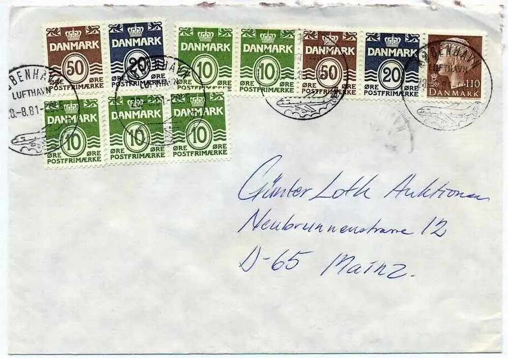 Luftpost-Brief, 28.08.1981, KOPENHAGEN – Mainz, Mischfrankatur, sauber gest., Maße: 16,3 x 11,5 cm
