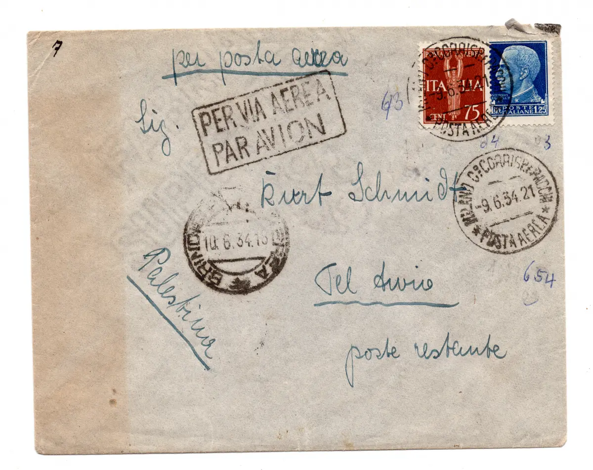 - Luftpost Cent. 75 Nr. 12 + Ergänzung Kaiserliche Lire 1,25 auf Luftumschlag (Poststopp) für Palästina am 9.6.34 auf dem Luftweg von Brindisi - leichte Mängel, aber ungewöhnlich für Fachmann Nr. 189/18