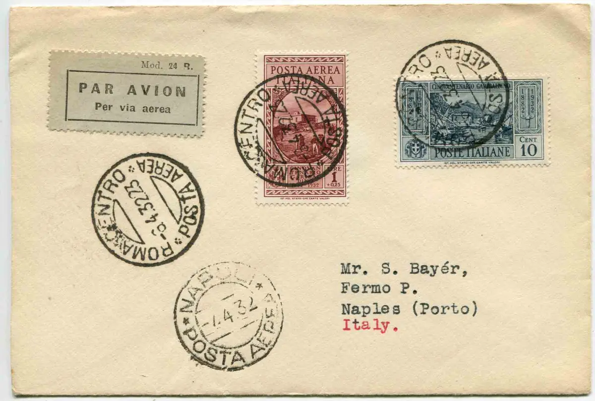 Luftpost Garibaldi Lire 1 + Ergänzung auf Aerogramm aus Rom - Luftpost Garibaldi Lire 1 Nr. 34 + ergänzende Post.O. Nr. 315 auf Airbrush von Rom nach Neapel am 6.4.32 (I. Ausgabetag) - Interessanter, von Bayer vorbereiteter Flug, noch nicht im Longhi-Katalog Nr. 315 erwähnt. 328/5