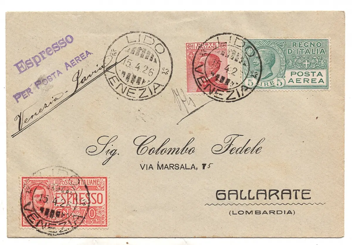 Umschlag - Luftpost 5 Lire grün Nr. 7 + ergänzende Post Nr. 111 + Espresso Nr. 11 auf Aerogramm von Venedig Lido nach Gallarate am 15.4.26 mit Wasserflugzeug auf der Linie Venedig - Pavia - Sehr schön - Kat. euro 550 Cod. 3241/WEB