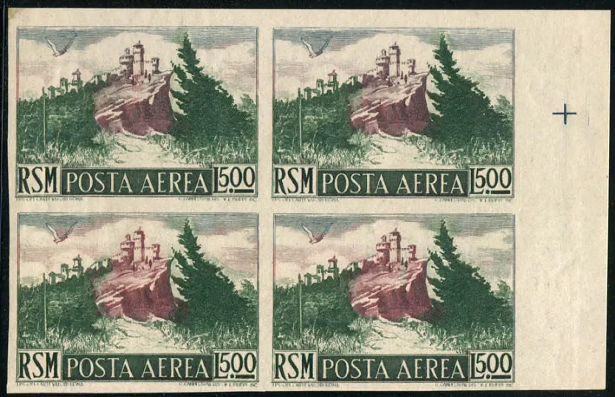 Luftpost Lire 500 Viertelansicht b. von f. ungezähnt Vollgummi - Luftpost Lire 500 Ansicht Nr. 91b Quartina b. von f. ungezähnt - Selten - ED - Kat. euro 4.000 Code 686/11