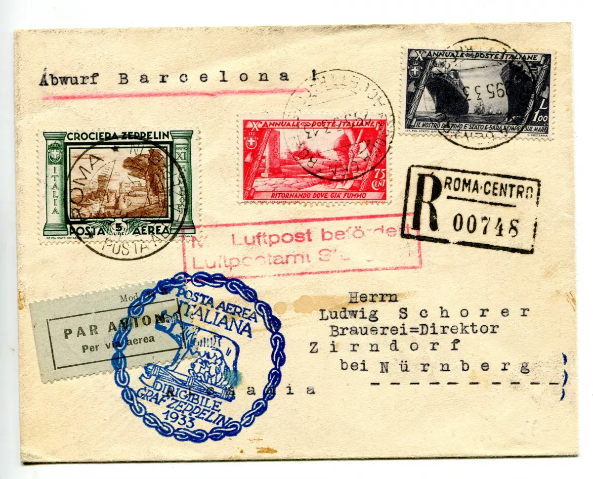 Umschlag - Luftpost Zeppelin Lire 5 Nr. 46 + ergänzende P.O. Nr. 334 + 335 auf Aerogramm Racc. für Deutschland am 29.5.33 - Bj. Kreuzfahrt-Special + rote Seite im Ordner Mit Luftpost. - Kat. euro 500 n. 335/A