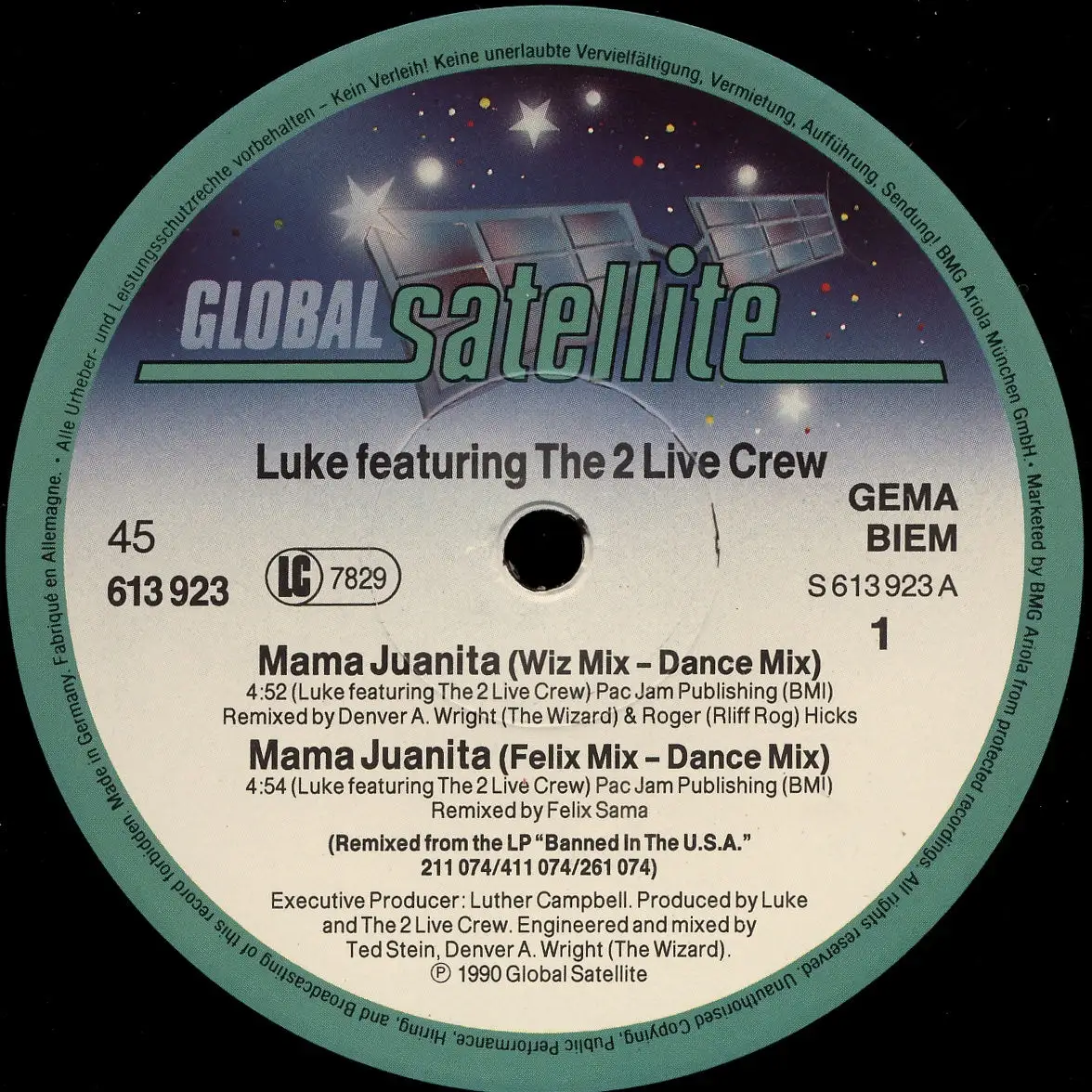 12" Maxi Luke feat. 2 Live Crew - Mama Juanita, Zustand Platte VG+ Hülle VG; Made in Germany 1990 Global Satellite 613 923, Tracks Wiz Mix, Dance Mix 4:52, Felix Mix, Dance Mix 4:54, Wiz Mix, Black Mix 5:00, Mr. Mixx Mix 3:39