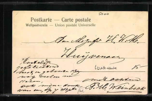 Personenbezogene Daten auf der Rückseite der Karte wurden durch blauen Textmarker unkenntlich gemacht. Die blauen Stellen sind auf die Vorderseite durchgeweicht und wirken sich negativ auf das Postkartenfoto aus
